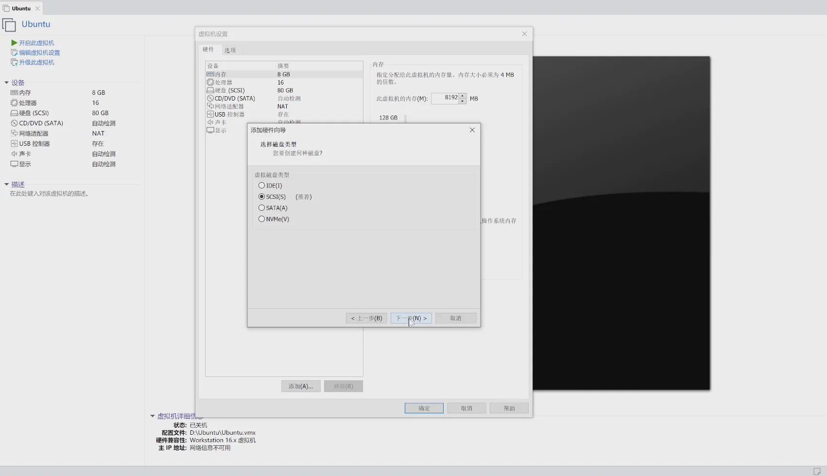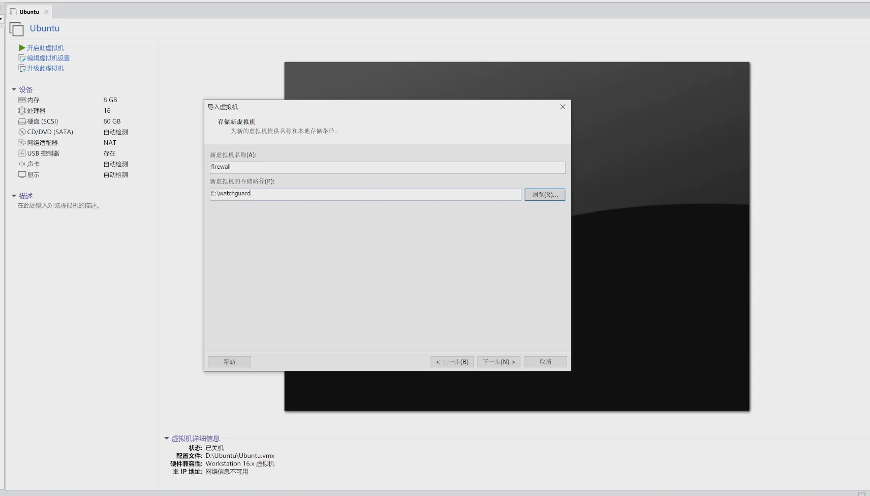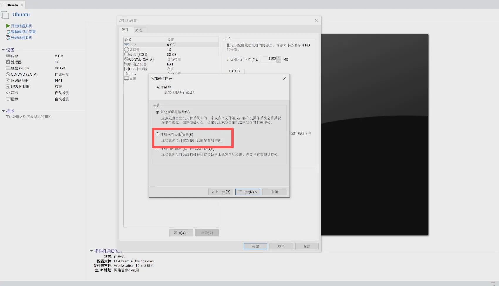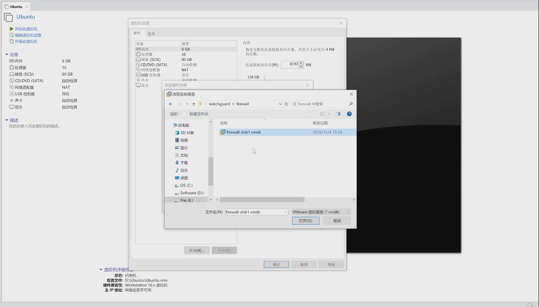 添加硬盘,选择SCSI,选择已有虚拟磁盘,选择firewall的vmdk路径,保持现有格式不转换,加载