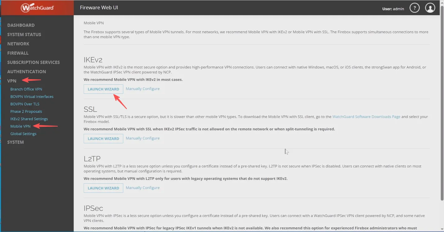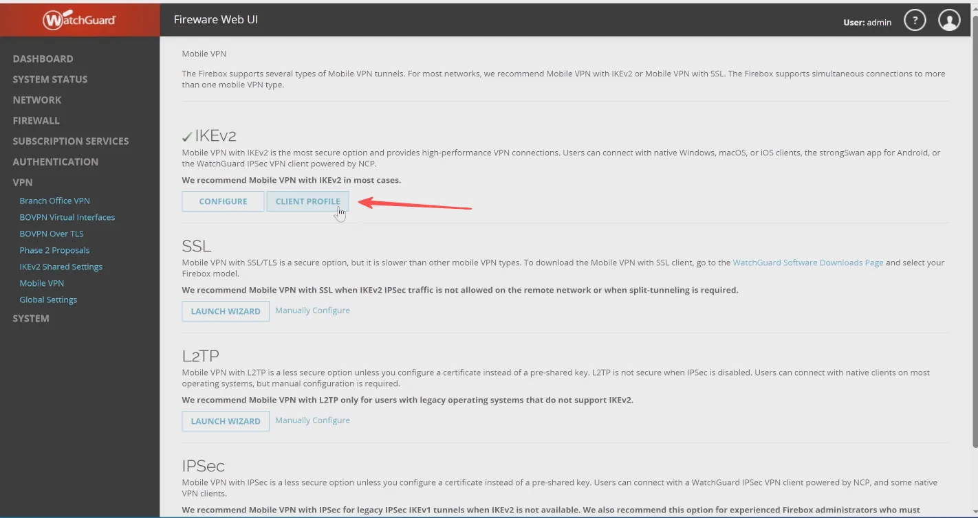 进入web ui后,侧边选择vpn->Mobile vpn->IKEv2,按照向导正常配置,配置完成后,再次回到首页,下载证书相关。